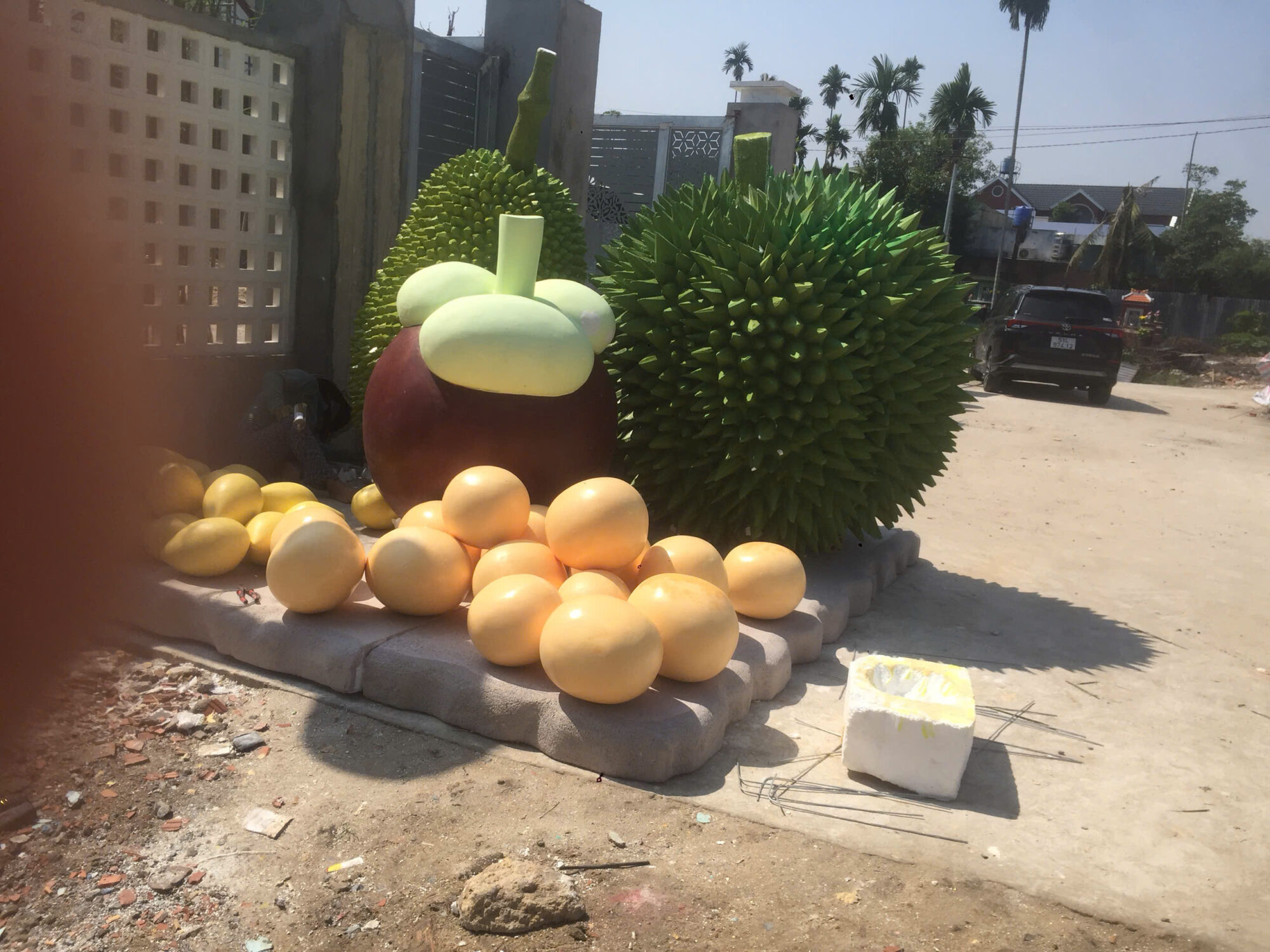 Trong dự án này, các hình trái cây khổng lồ như sầu riêng, măng cụt, trái cây trang trí được gia công từ mút xốp, tạo hình tỉ mỉ sơn hoàn thiện để mang lại hiệu ứng chân thực, bắt mắt.